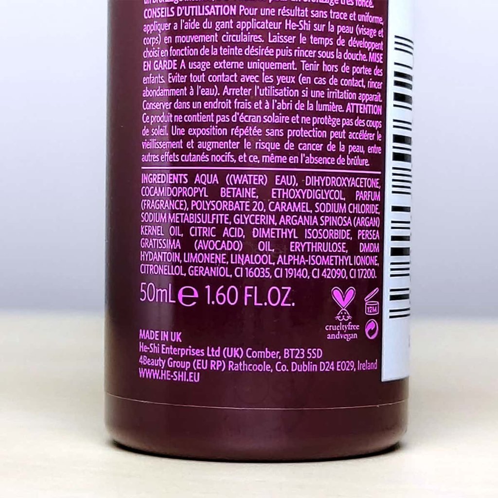 He-Shi Rapid 1Hour Mousse neobsahuje žiadne farbivá okrem sprievodnej farby (Cosmetic Colour Guide). Tá sa do prípravku pridáva zámerne preto, aby indikovala miesta, kde už bola samoopaľovacia pena nanesená. To zaručí rovnomerné rozotrenie po pokožke. Samoopaľovacie látky sú totiž bezfarebné.