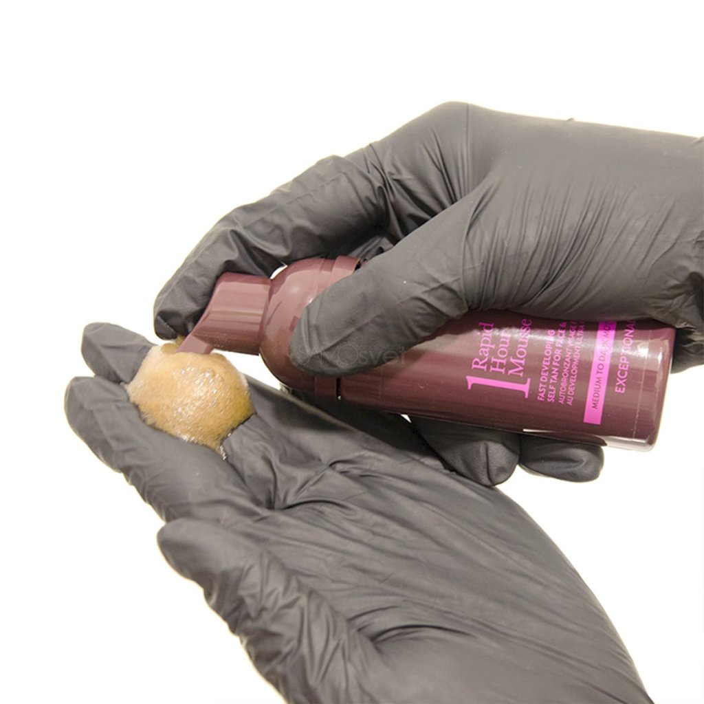 Pre dokončenie aplikácie samoopaľovacej peny si opatrne vyzlečte rukavice a opakom rúk pretrite prsty a vrchnú časť rúk. Použite pritom len minimum samoopaľovacej peny a prípravok nevtierajte medzi prsty. (Aplikácia je rovnaká ako u He-Shi Express - Pozri aplikačné video). Nepoužívajte dlane, pretože pokožka na dlaniach by sa nepekne zafarbila.